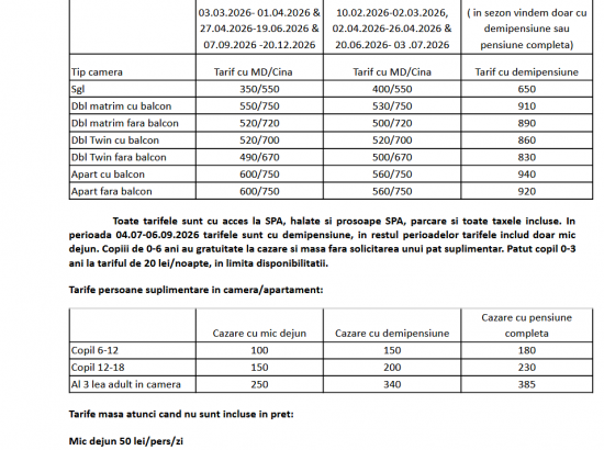In perioada 04.07-06.09.2026 tarifele sunt cu demipensiune, in restul perioadelor tarifele includ doar mic dejun. Tarife masa atunci cand nu sunt incluse in pret: Mic dejun 50 lei/pers/zi Pranz 50 lei/pers/zi Cina 90 lei/pers/zi