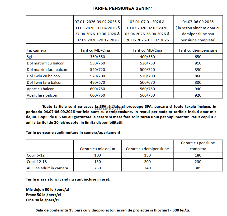 In perioada 04.07-06.09.2026 tarifele sunt cu demipensiune, in restul perioadelor tarifele includ doar mic dejun. Tarife masa atunci cand nu sunt incluse in pret: Mic dejun 50 lei/pers/zi Pranz 50 lei/pers/zi Cina 90 lei/pers/zimineu